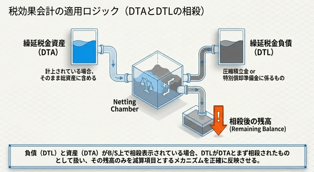 総資産から差し引く圧縮積立金等の額は、「積立金本体」に「それに関連する繰延税金負債」を加算した額です。 - 相殺処理の優先順位: