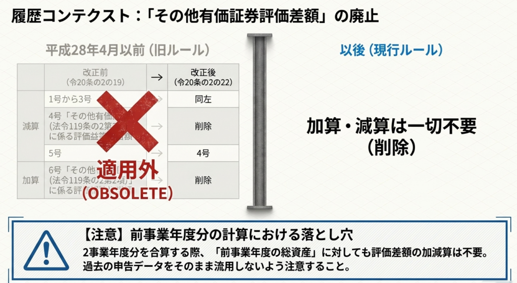 改正により、総資産の帳簿価額の計算において「その他有価証券評価差額」の加算および減算が不要となりました。この改正は平成28年4月1日以後に開始する事業年度から適用され、前事業年度分の計算においても同様に加減算は不要です。
