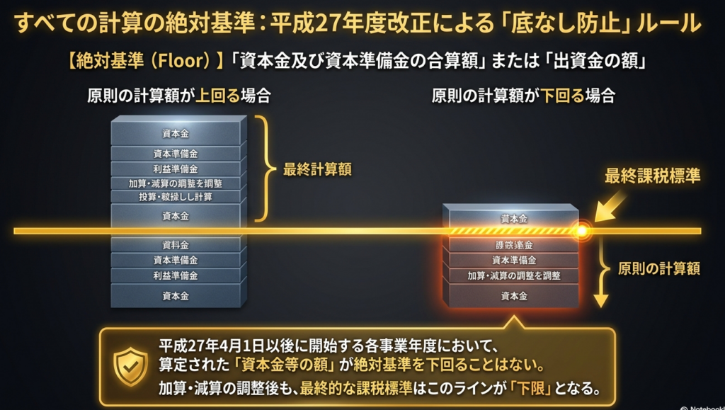 特に平成27年度税制改正により導入された「底上げルール(下限設定)」は、企業の資本政策が税額に与えるインパクトを劇的に変化させました。これは、実質的な資本規模に即した課税を担保し、会計的な処理のみで税基盤が毀損されることを防ぐ目的があります。