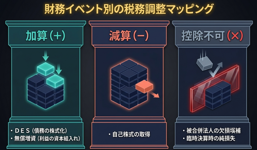ここで重要なのは、評価損益の実現という視点です。DESに際して債務の時価と帳簿価額に差がある場合、その評価損益が法人税上の資本金等の額に影響を与え、結果として地方税の課税標準を変動させます。会計上の仕訳と税務上の資本金等の額がズレるポイントであり、DES実施時には必ず「税務上の加算額」を再計算する必要があります。