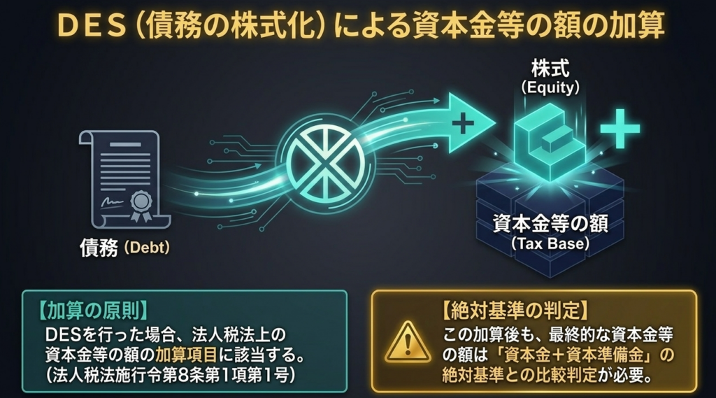 DESを原資とする無償増資は、資本割の課税標準を押し上げる要因となります。債務の株式化(DES)を行った場合、法人税法施行令第8条第1項第1号に基づき、法人税法上の「資本金等の額」の加算項目となります。