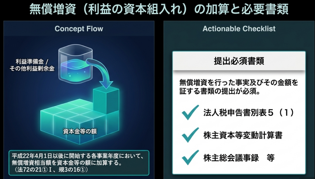 無償増資の事実と金額を証する書類として、法人税申告書別表5(1)、株主資本等変動計算書、または株主総会議事録などの提出が必要です。