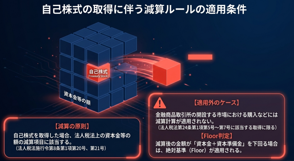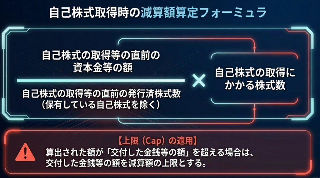 自己株式を取得した場合、法人税法施行令第8条の規定に基づき、法人税法上の「資本金等の額」の減算項目となります。資本割においてもこの取扱いに準拠しますが、市場外取得等の場合には以下の計算式を用います。