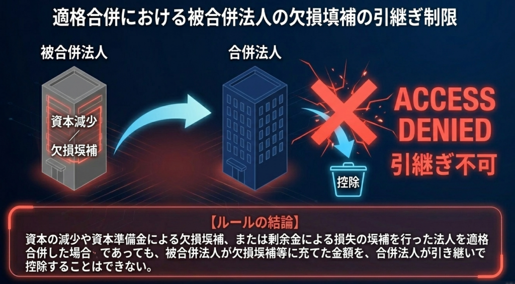 適格合併において、被合併法人が合併前に行っていた無償減資等による欠損塡補額を、合併法人が引き継いで資本金等の額から控除することは認められません。 これは、欠損塡補に伴う資本金等の額の調整が、その行為を行った特定の法人において完結すべき性質のものであるためです。