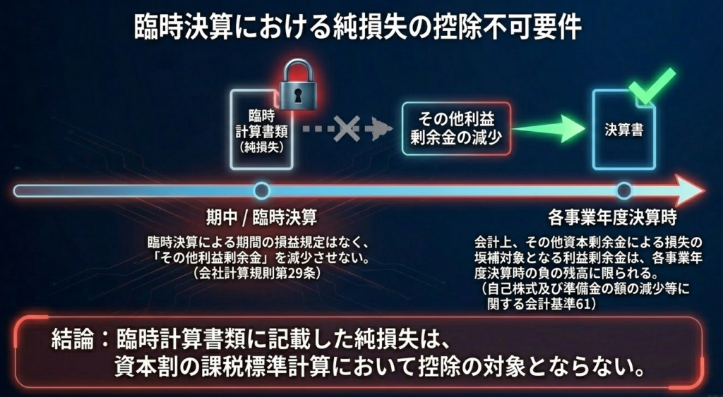 期中に臨時決算を行い、臨時計算書類に計上された純損失については、資本割の控除対象となる「損失」には該当しません。