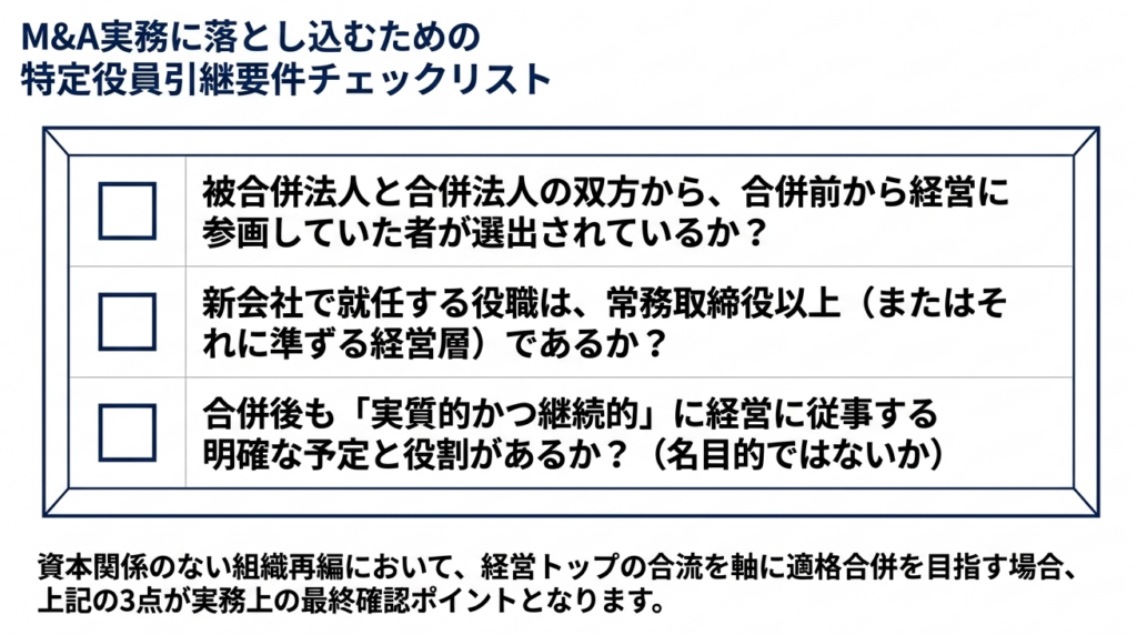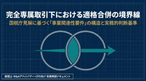 特定役員引継要件の活用は、非関連者間M&Aにおける税制上の「生命線」です。会計・経理担当者は、これを単なる「役職名の照合事務」と捉えてはなりません。適格性の否認は、ディールそのものの経済合理性を根底から覆す破壊力を持っています。