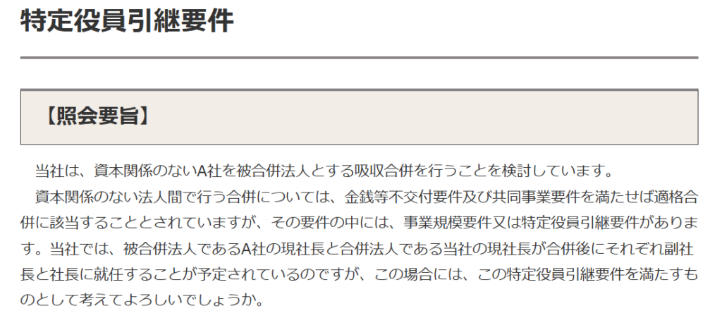 本照会事例(被合併法人の現社長が合併法人の副社長に就任し、合併法人の現社長が引き続き社長として留任するケース)について、結論を述べれば、「特定役員引継要件」を充足し、他の要件(金銭等不交付要件等)と併せて適格合併に該当すると判断されます。