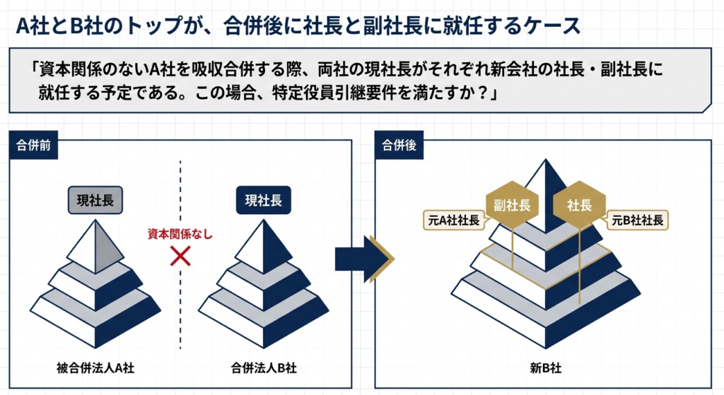 特定役員引継要件の本質は、合併前の両社の経営中枢が、合併後の新体制においても実効性を持って融和・継続することにあります。本事例のような社長・副社長の布陣は、まさに「経営面からの共同事業の担保」という立法趣旨を具現化したものであり、税務上の合理性は極めて高いと言えます。