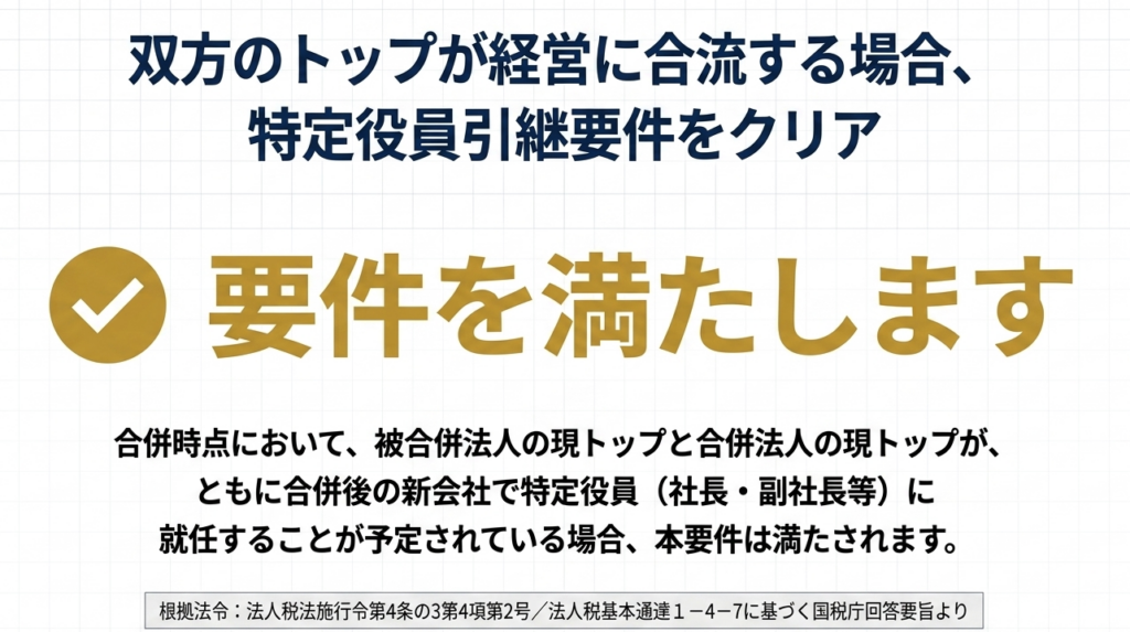 この要件は、合併前の両社それぞれの「特定役員」が、合併後も共同して合併法人の特定役員に就任する見込みであることを求めています。特定役員とは、社長、副社長、代表取締役など、法人の経営に実質的に従事している者を指します。