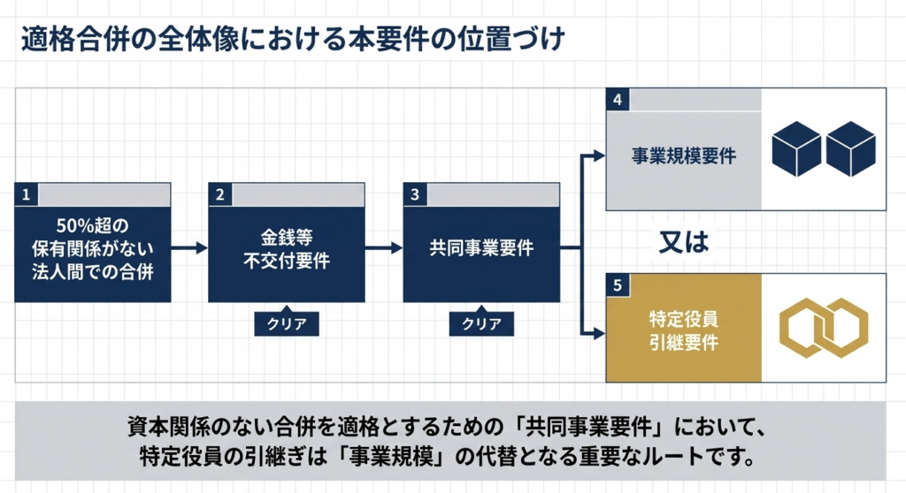 特定役員引継要件は、共同事業要件を構成する要素の一つとして規定されています。具体的には、事業規模要件を満たさない場合であっても、この特定役員引継要件を満たせば共同事業要件の一部を充足したことになります。