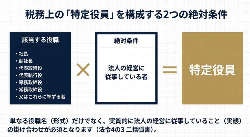 法令上、特定役員とは以下の役職、またはこれらに準ずる者で、実質的に法人の経営に従事している者を指します。