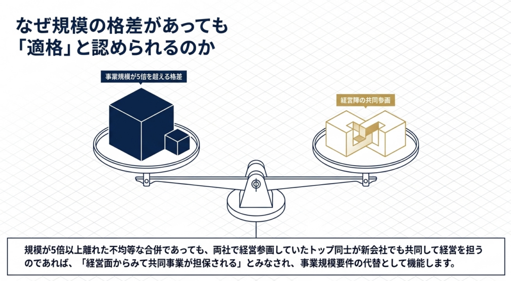 事例のように、両社の社長が合併後に社長と副社長に就任する場合は、要件を満たします。両社の経営陣が共同して経営に参画することで共同事業が担保されるため、両社間に5倍を超えるような事業規模の差があっても適格合併として認められます。