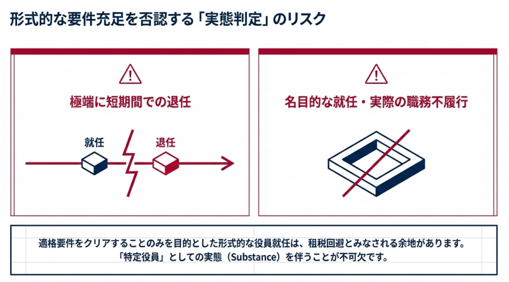 名目的な特定役員であるとみなされ、適格要件を形式的に満たすためだけに就任させたと判断される余地があります。実態を伴わない就任は、要件の否認につながる注意点として挙げられています。