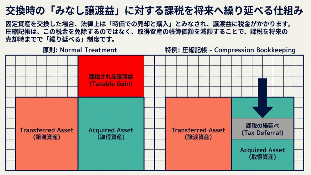 この納税資金の不足という実務上の大きな障壁を回避し、円滑な資産の組み換えを支援するために用意されているのが「交換による圧縮記帳(法人税法第50条)」の特例制度です。本制度を活用することで、譲渡益に対する課税を将来へ繰り延べ、キャッシュフローを維持したまま資産の最適化を図ることができます。