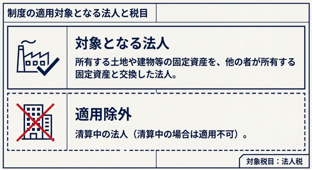 本制度は、継続企業(ゴーイング・コンサーン)の資産組み換えを支援する趣旨であるため、清算中の法人については適用が認められません。組織再編や解散が絡む案件では、まずこの入り口要件を慎重に確認する必要があります。