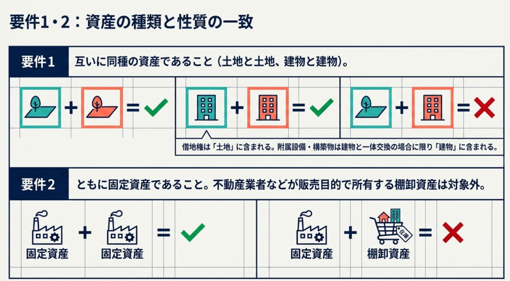 - 双方が固定資産であり、土地同士など互いに「同じ種類の資産」であること。