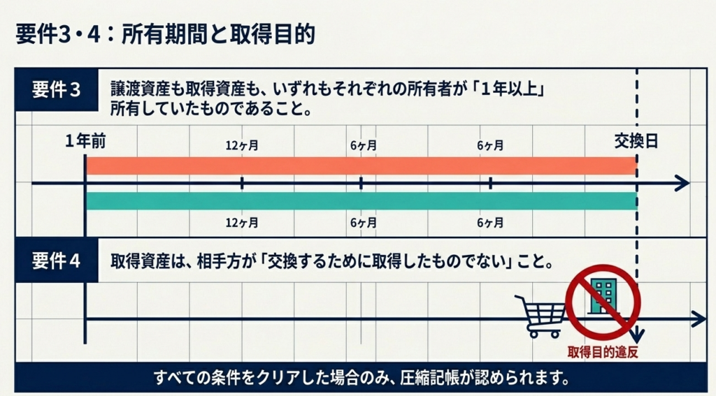 譲渡資産および取得資産のいずれも、それぞれの所有者が交換の日まで1年以上所有していたものである必要があります。