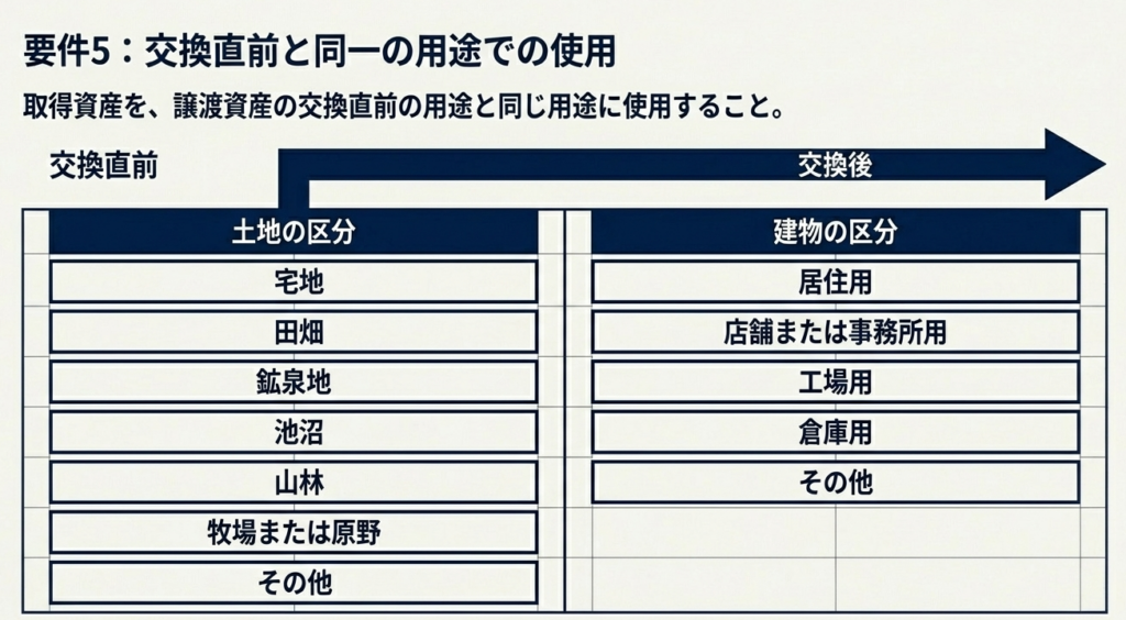 取得資産は、譲渡資産が交換直前に使用されていた用途と同じ用途に使用しなければなりません。例えば、土地であれば宅地や田畑などの区分、建物であれば居住用や店舗用などの区分が同一であることが求められます。