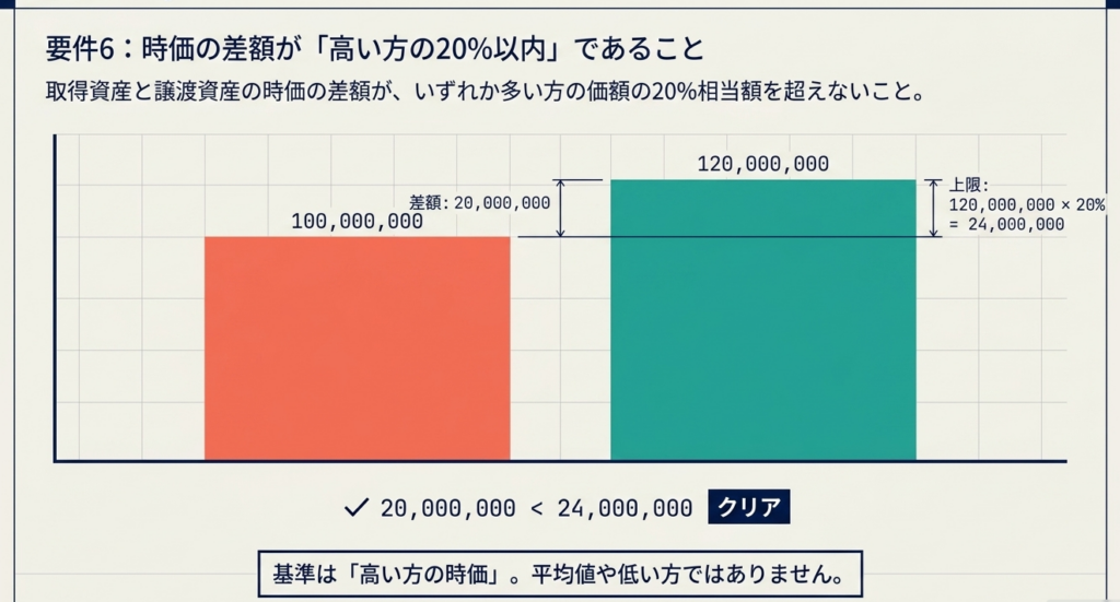 交換時における取得資産と譲渡資産の時価の差額が、いずれか高い方の価額の20%以内である必要があります。