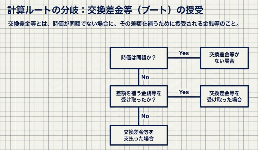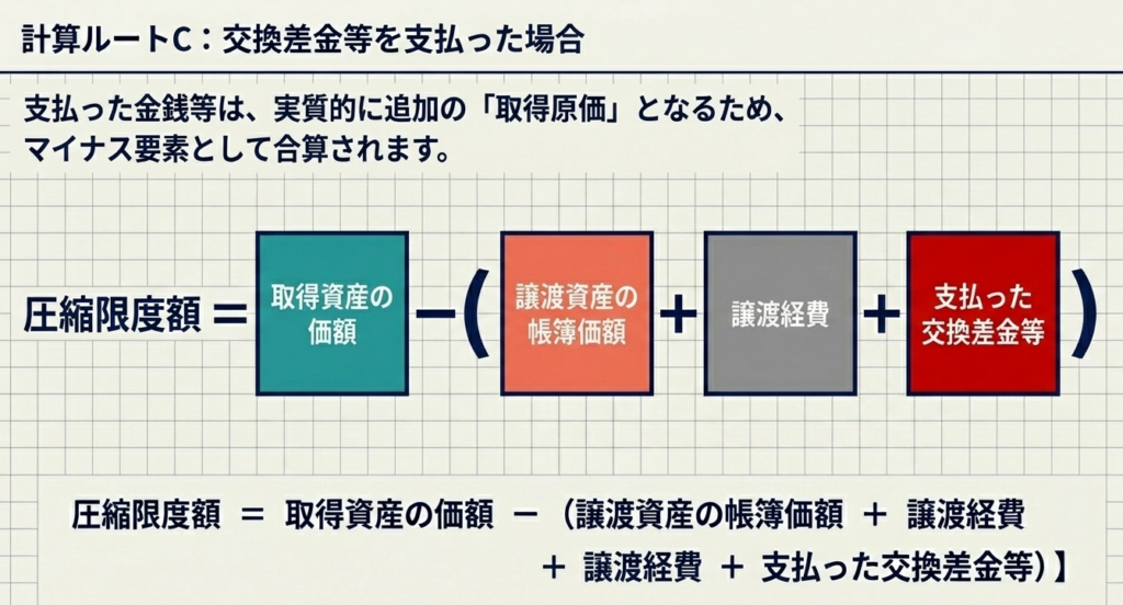 | 交換差金等を支払った場合 | 取得資産の時価 – (譲渡資産の帳簿価額 + 譲渡経費 + 交換差金等) |