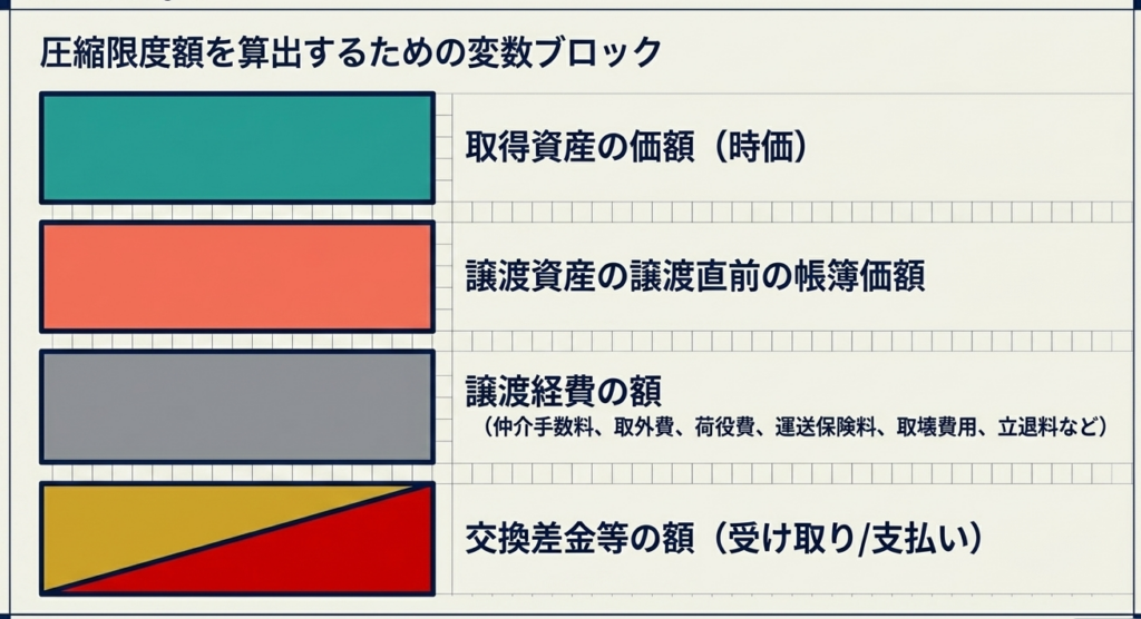 | 圧縮限度額 | 圧縮記帳によって損金の額に算入できる最大限の金額。交換差金の有無により計算式が異なる。 |