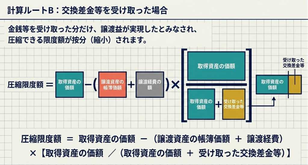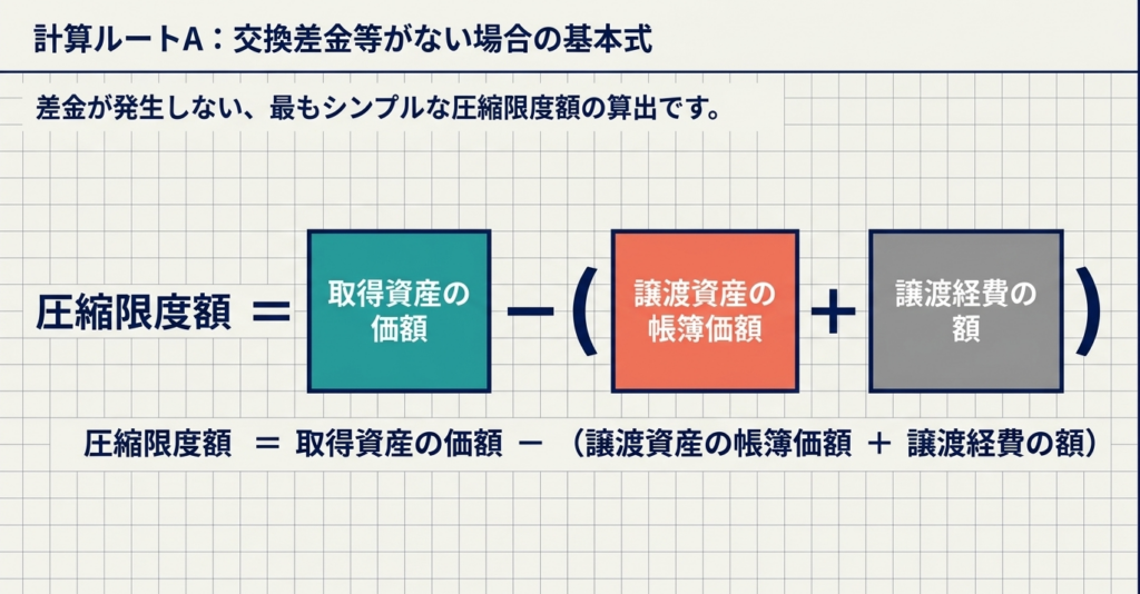 時価の差を補うために授受される「交換差金等」の有無により、圧縮限度額の計算式は以下の3パターンに分かれます。