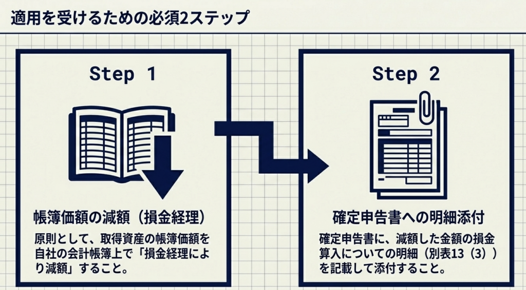適用を受けるためには、原則として損金経理により取得資産の帳簿価額を減額し、確定申告書に損金算入の明細を添付する必要があります。