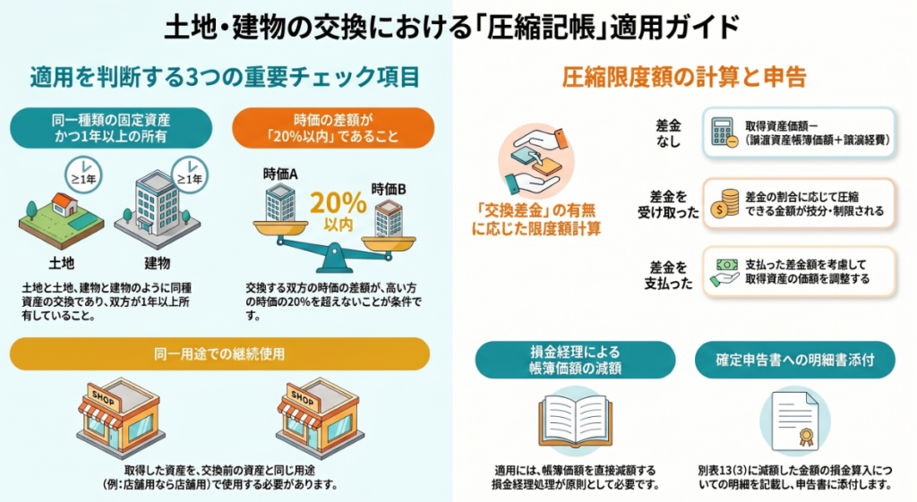 土地建物等の交換における圧縮記帳の実務解説:課税繰延べの要件と算定手法