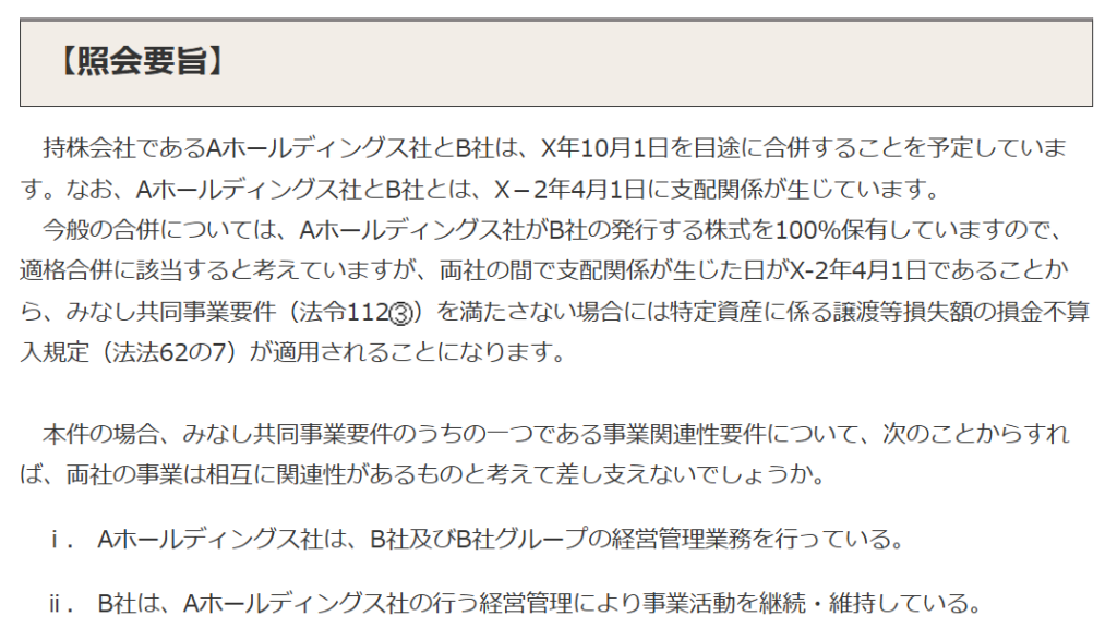 国税庁から公表されている質疑応答事例「持株会社と事業会社が合併する場合の事業関連性の判定について」について解説します。