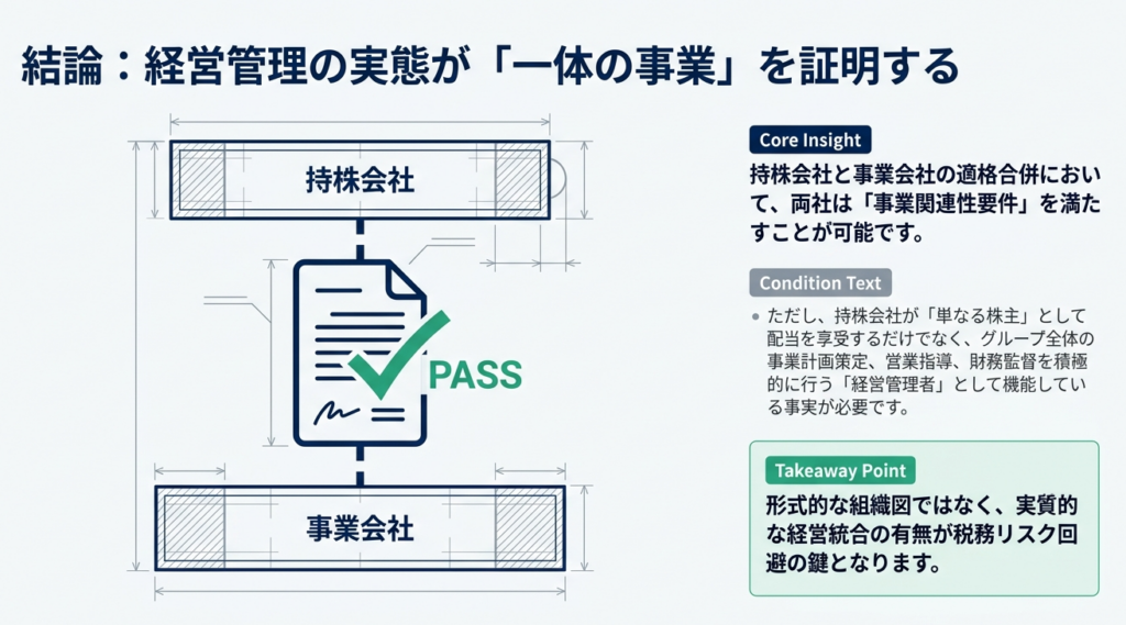 ここで重要なのは、持株会社が単一の事業会社を管理するだけでなく、グループ全体の財務や監査を統括する「コントロールタワー(司令塔)」として機能している点です。このような実態があれば、持株会社と事業会社は「一体としての事業実態」にあると認められ、条文上の関連性を担保することが可能となります。