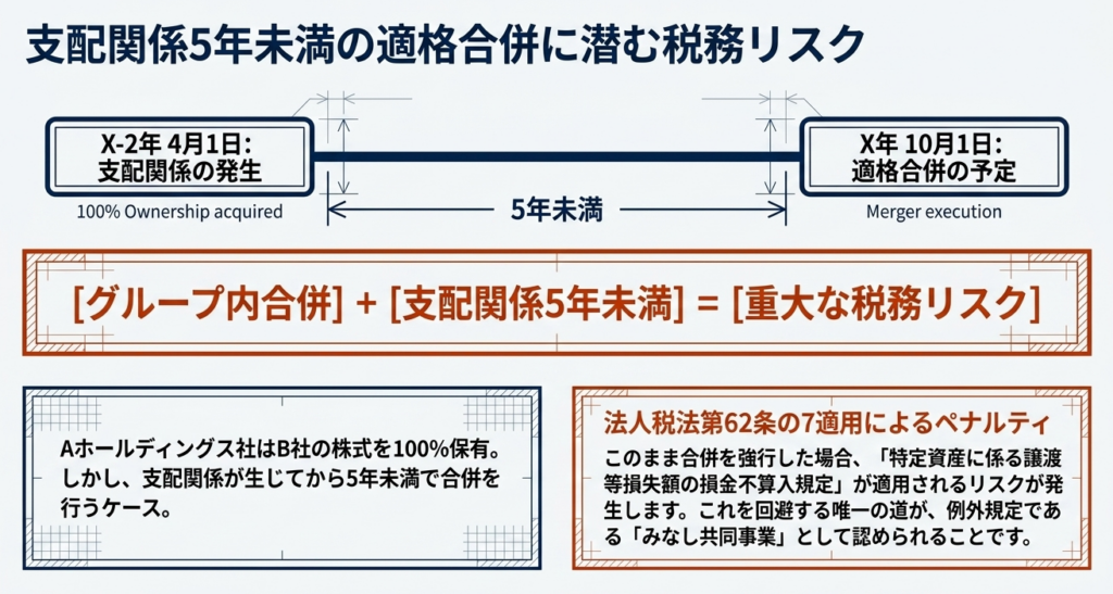 支配関係が生じた日(X-2年4月1日)が合併日より一定期間前である場合、みなし共同事業要件の充足が損金不算入規定の適用の有無を左右するためです。本事例では支配関係発生後の合併であるため、要件判定が税務リスク管理の焦点となります。