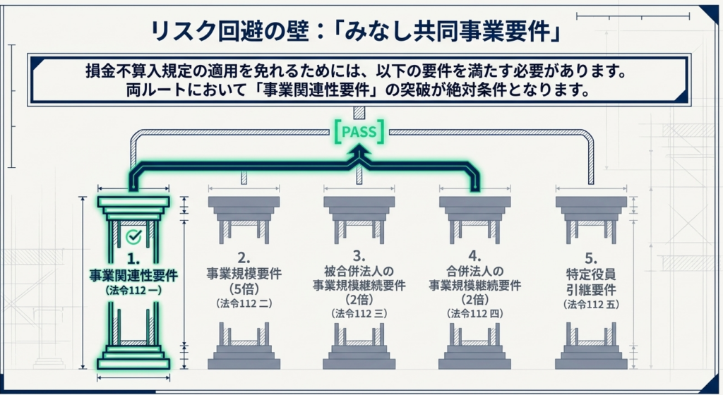 なぜこれほどまでに重要視されるのか。それは、本要件を満たせない場合、法人税法第62条の7に基づく「特定資産に係る譲渡等損失額の損金不算入」という極めて重い制限が課されるからです。これは被合併法人が抱える含み損の損金算入を封じる規定であり、要件判定を誤れば、当初目指していた再編の経済的メリットは霧散し、多大な追徴リスクを背負うことになります。