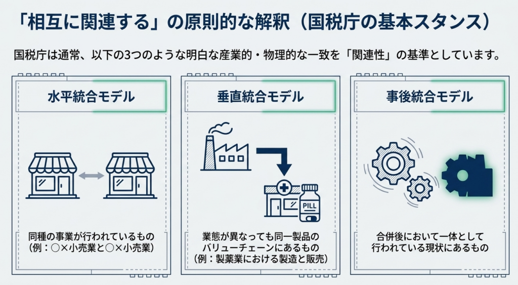 一つは「同種の事業」が行われている場合(例:小売業と小売業)です。もう一つは、業態が異なっても同一製品の製造と販売のように「それぞれの事業が関連」している場合(例:製薬業における製造と販売)が挙げられます。