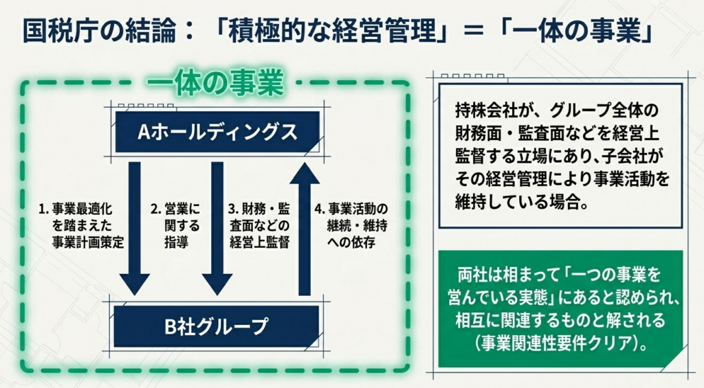 Aホールディングス社が経営管理を通じてB社グループを監督し、B社がその管理のもとで事業を継続・維持しているという「一体として一つの事業を営んでいる実態」があることです。この密接な関係が認められることで、両社の事業は相互に関連すると解釈されます。