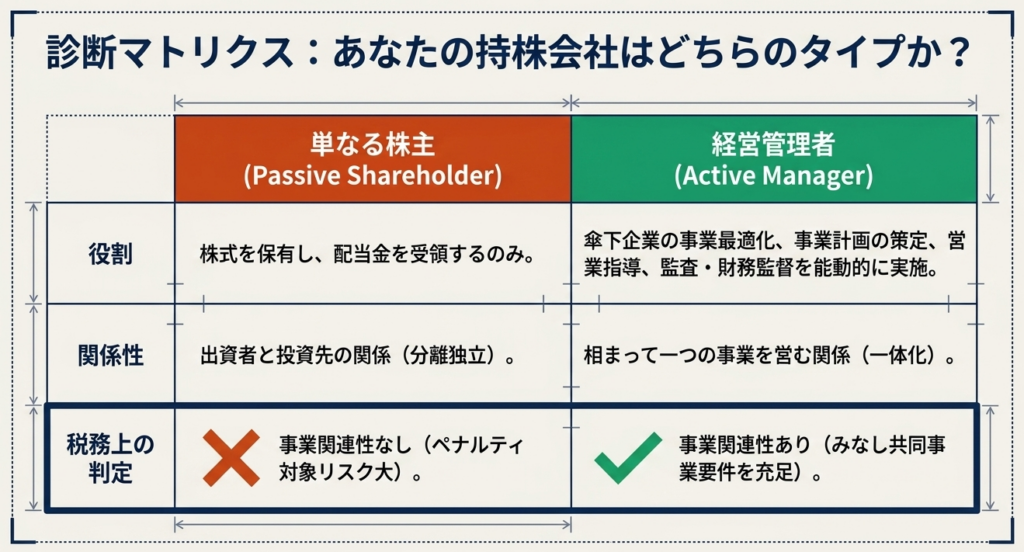 単に配当を受領するだけの「静的な所有(Passive Holding)」であれば、それは投資活動に過ぎず、事業関連性は否定されます。