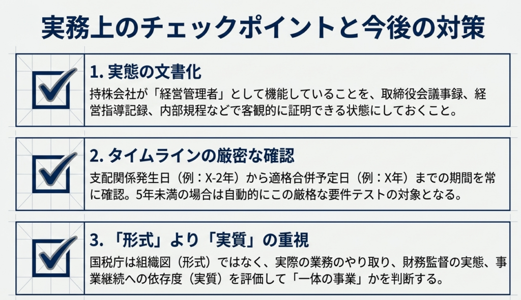 実務担当者は、「経営管理という事業」が真に存在することを客観的に証明できるよう、以下のチェックポイントに基づいた防御策を講じる必要があります。