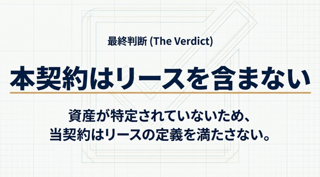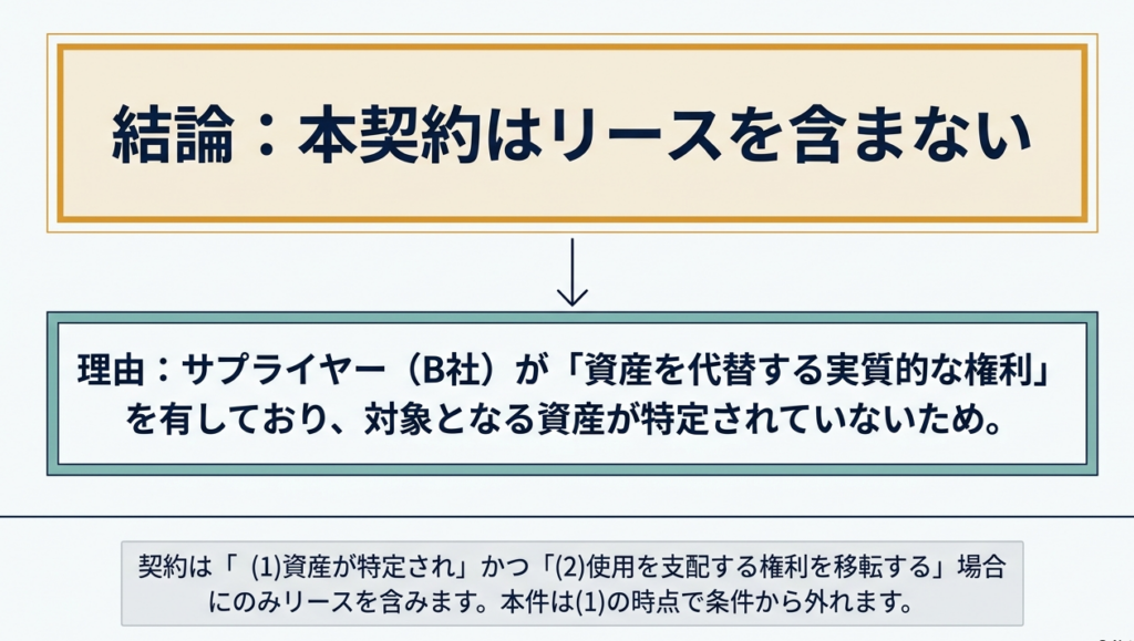 このように「代替する能力」と「代替による経済的利益」の両方を満たすため、サプライヤーには実質的な代替権があるとみなされます。結果として「資産は特定されていない」と判定されるため、他の要件を検討するまでもなく、この契約は「リースを含まない」と結論づけられます。