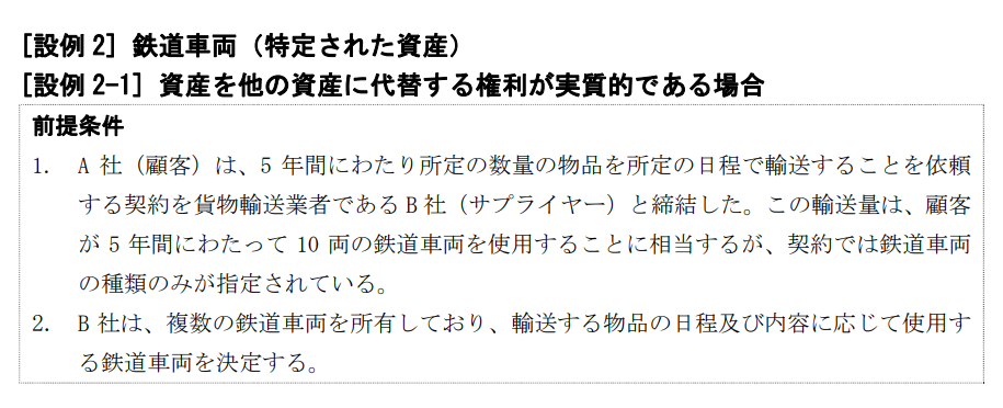 企業会計基準適用指針の[設例 2-1](鉄道車両のケース)は、サプライヤーが実質的な代替権を有しているため、結果として「リースを含まない」と結論付けられる典型的な事例です。