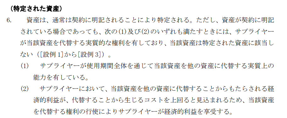 | 特定された資産 | 契約において明記されるか、または使用可能になった時点で特定される資産。ただし、サプライヤーが実質的な代替権を持つ場合は「特定」とはみなされない。 |