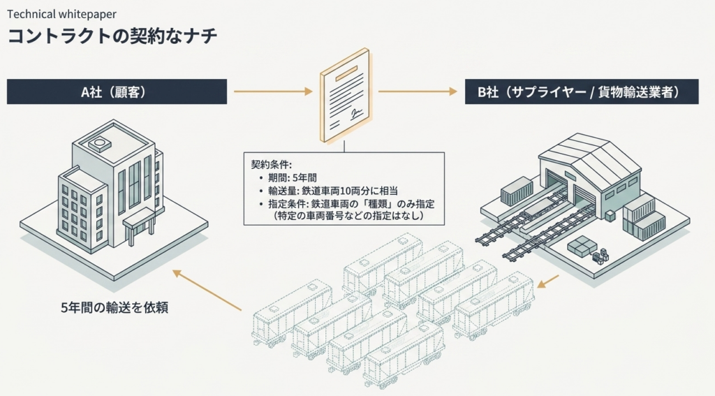 実務上、注目すべきは契約の前提条件です。この設例では、契約書において「鉄道車両の種類のみが指定されている」という点が、資産の特定を妨げる最初のシグナルとなっています。