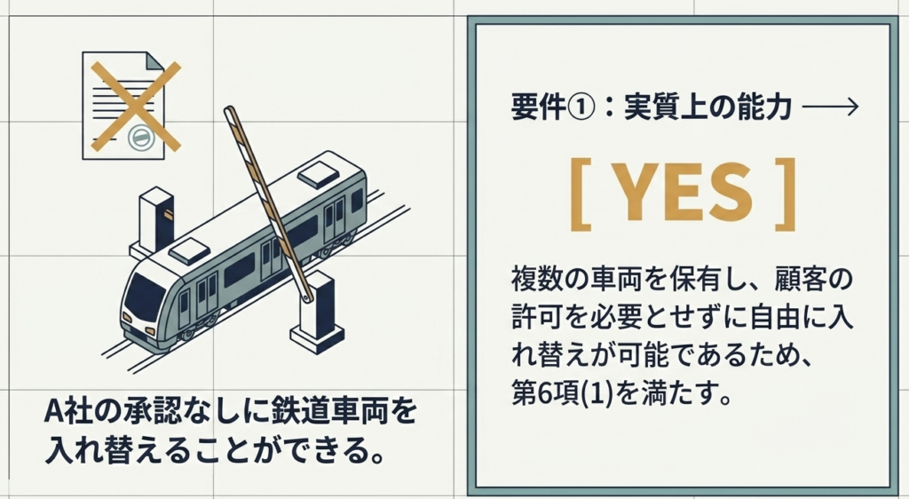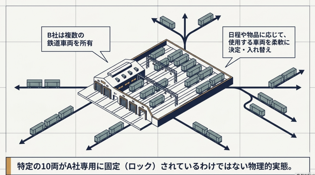 B社が複数の鉄道車両を所有しており、A社の承認なしに鉄道車両を入れ替えることができるため