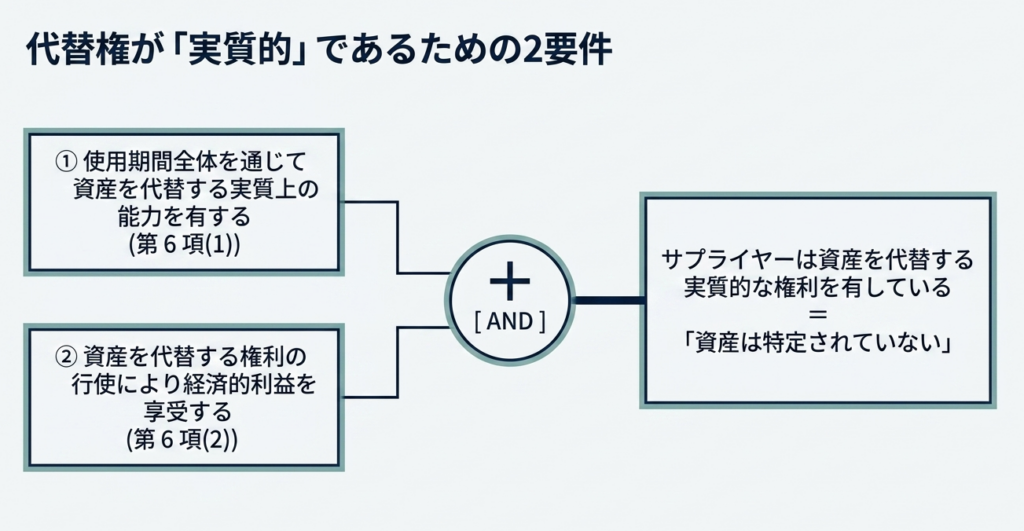 ①サプライヤーが使用期間全体を通じて資産を代替する実質上の能力を有し、②代替により経済的利益を享受すること