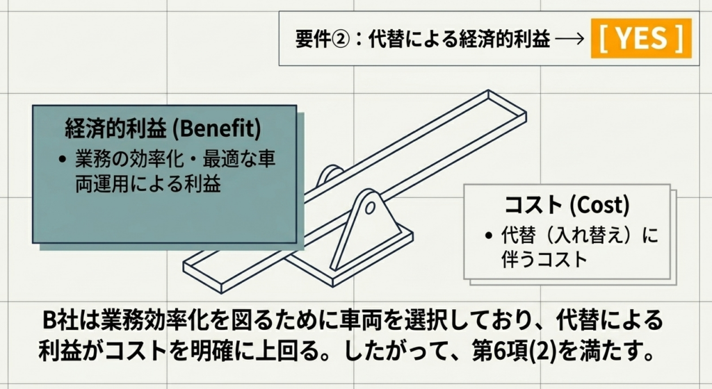 B社は車両の代替を決定することで業務を効率化しており、そこから得られる利益がコストを上回るため、経済的利益を享受する(指針第6項(2)の充足)。 - 結論:
