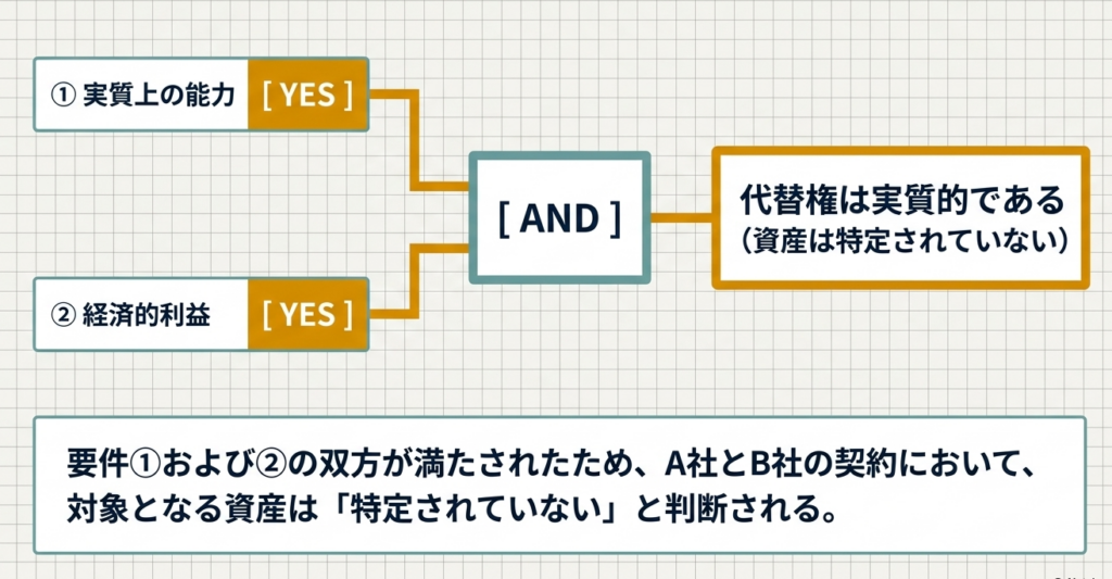 次のセクションでは、この「資産の特定」を左右する核心的な概念である「実質的な代替権」について、具体的な設例をもとに解説します。