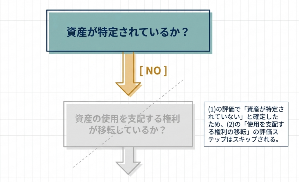 新基準において、資産が特定されなければ、その時点で「リースではない」という結論が確定します。つまり、資産の特定はオンバランス判定における「門番(ゲートキーパー)」の役割を果たしており、ここで「特定されていない」と判定されれば、使用支配権の検討を待たずにオフバランス処理が可能となります。