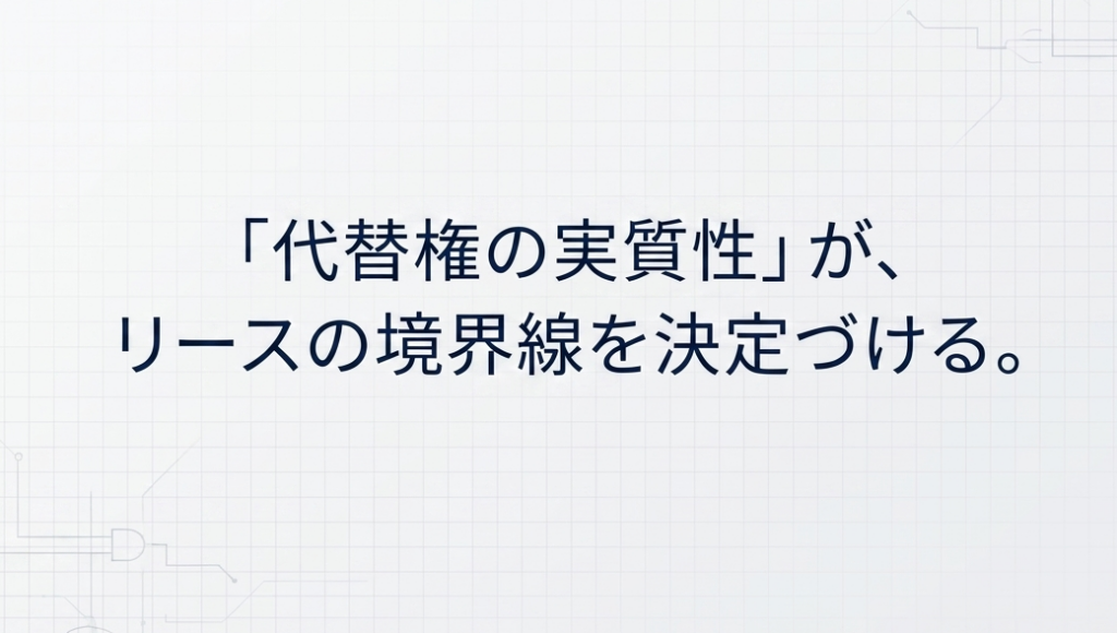| 実質的な代替権 | サプライヤーが、①使用期間全体を通じて資産を代替する「実質上の能力」を有し、かつ②代替により「経済的利益を享受」する場合に認められる権利。 |