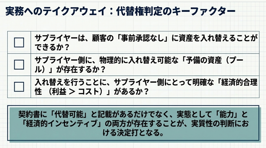 サプライヤーが、顧客の承認なしに、「使用期間全体を通じて」資産を他の資産に入れ替える物理的・法的な能力を持っているかを評価します。