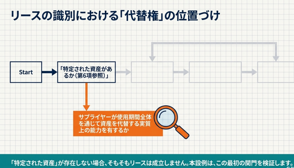 サプライヤー(B社)が「資産を代替する実質的な権利」を有しており、会計基準上の「特定された資産」が存在しないと判断されるため。