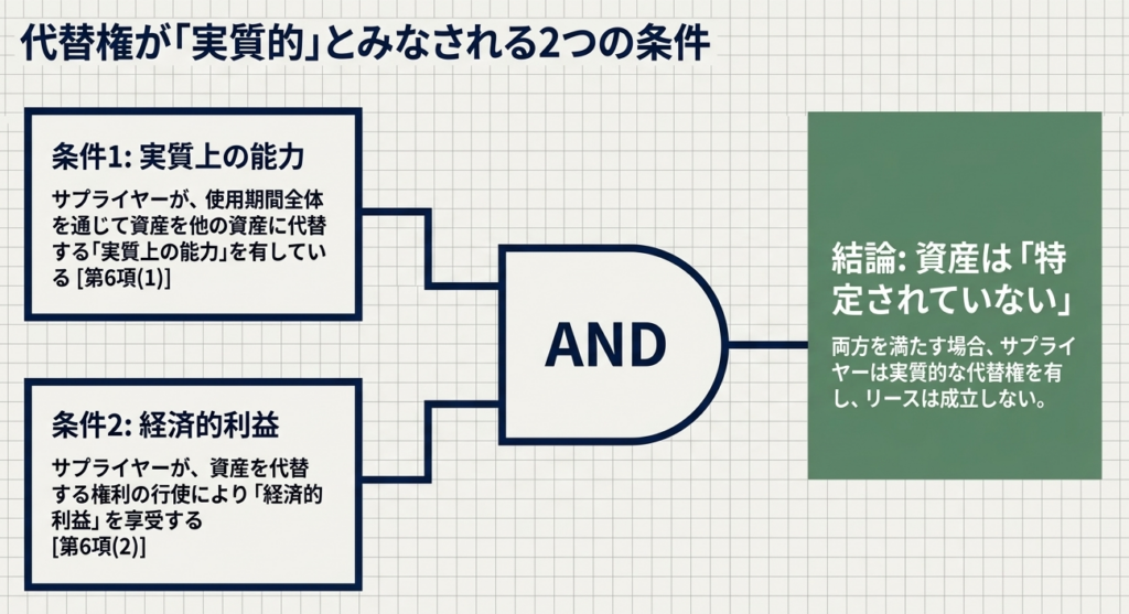 資産を代替する実質的な権利サプライヤーが、使用期間全体を通じて資産を代替する「実質上の能力」を有し、かつ代替によって「経済的利益」を享受できる場合に認められる権利。