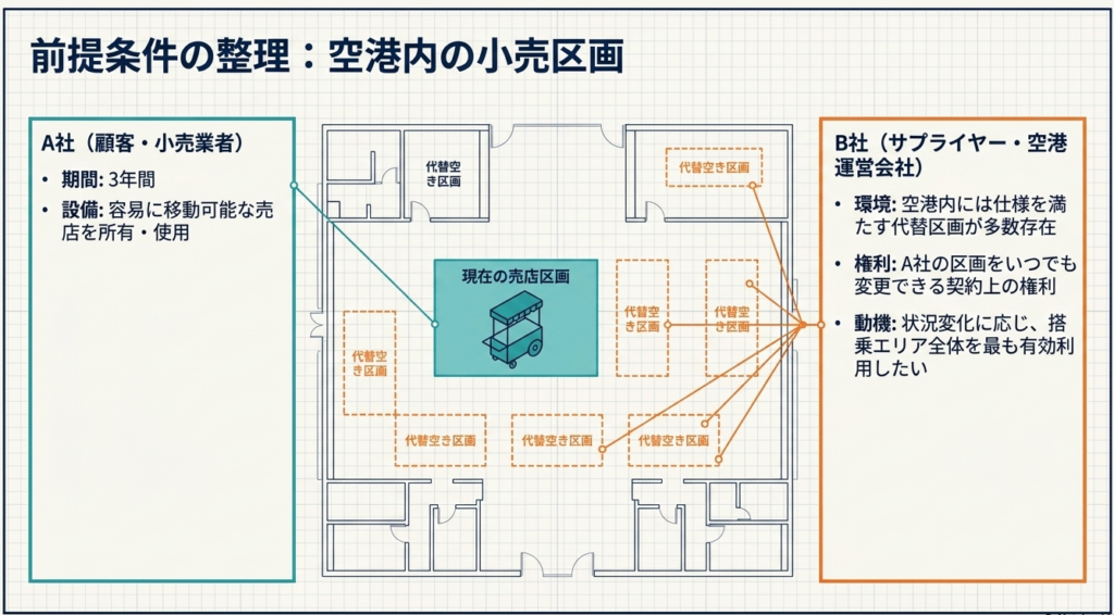 本設例において、空港内の搭乗エリアには、契約の仕様を満たす代替区画が「多数」存在しています。さらに重要なのは、B社が「使用期間中いつでも」、かつ「A社の承認なしに」一方的に区画を変更できる権利を有しているという点です。